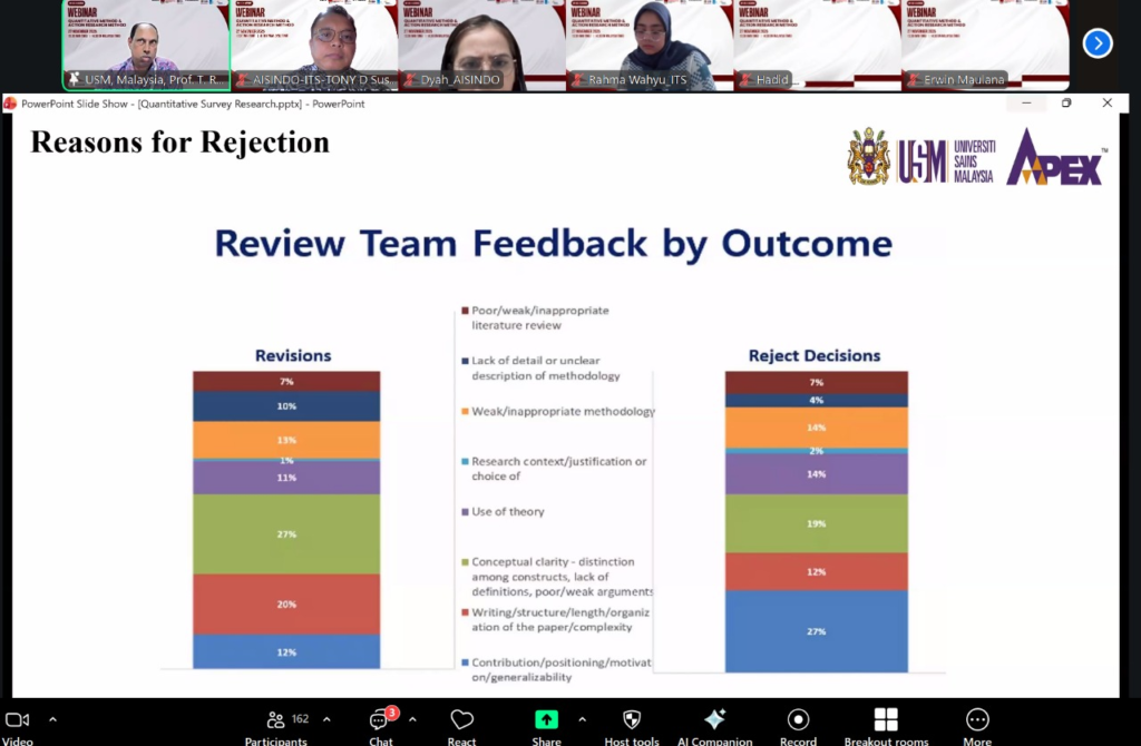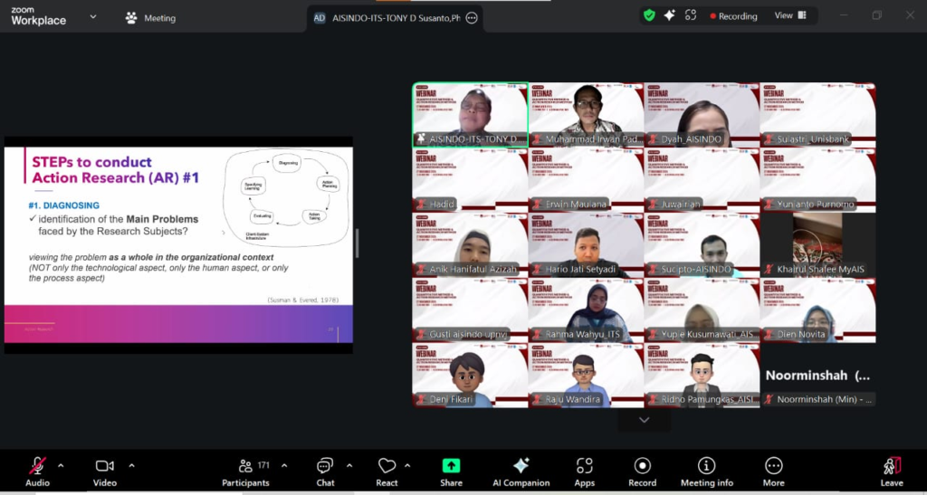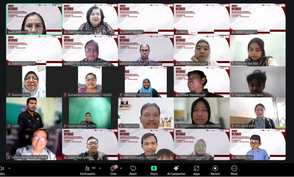 Pada tanggal 27 November 2025, Asosiasi Sistem Informasi Indonesia (AISINDO) berhasil menyelenggarakan webinar internasional yang membahas dua metode penelitian penting dalam dunia akademis dan riset, yaitu Metode Penelitian Kuantitatif dan Action Research. Acara yang merupakan hasil kolaborasi dengan MYAIS ini berlangsung secara daring melalui platform Zoom, diikuti oleh peserta dari berbagai kalangan, termasuk akademisi, peneliti, dan praktisi di bidang sistem informasi dan teknologi.