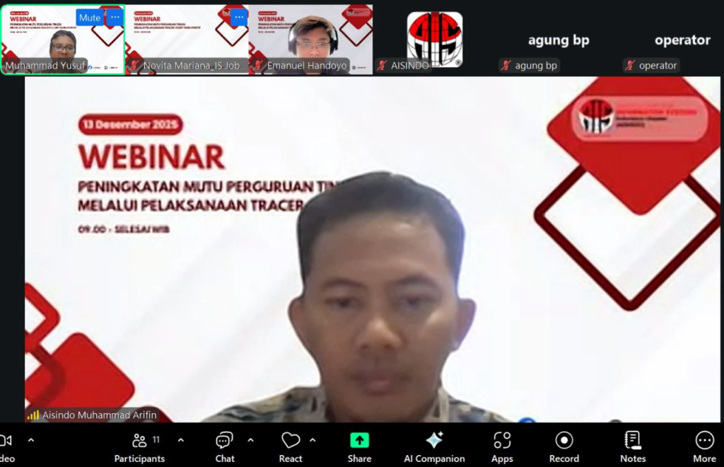 AISINDO baru saja menyelenggarakan webinar edukatif bertajuk “Peningkatan Mutu Perguruan Tinggi melalui Tracer Study yang Efektif” pada Sabtu, 13 Desember 2025, pukul 09.00 WIB hingga selesai, melalui platform Zoom.